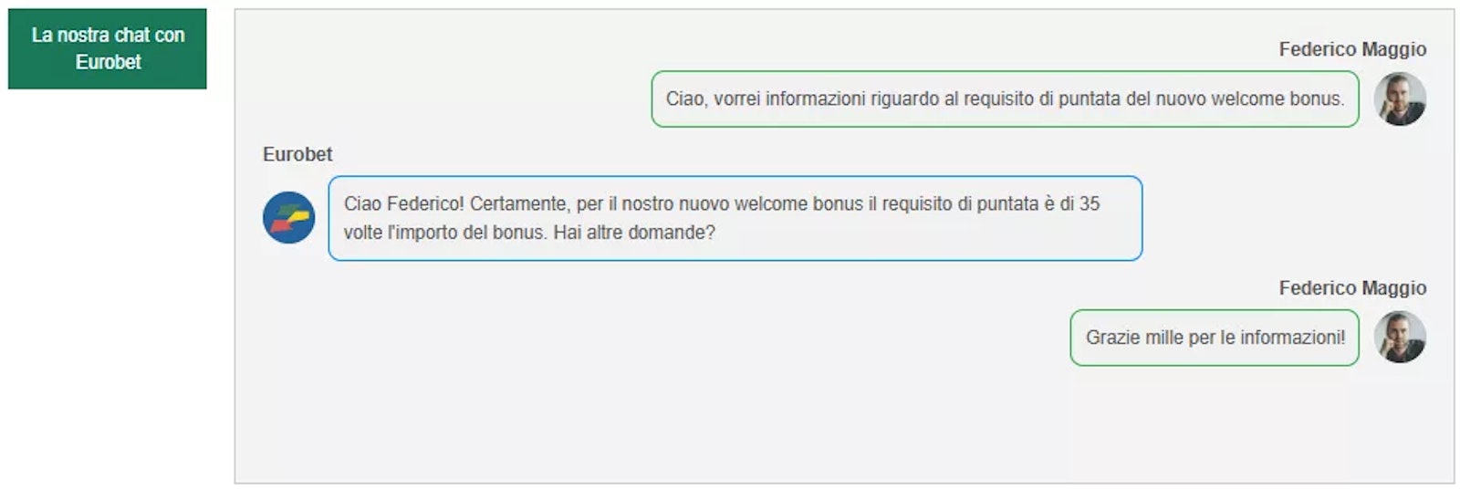 Per sbloccare il bonus sulle ricariche, è richiesto un requisito di puntata pari a 35 volte l'importo ricevuto, da soddisfare entro 7 giorni.